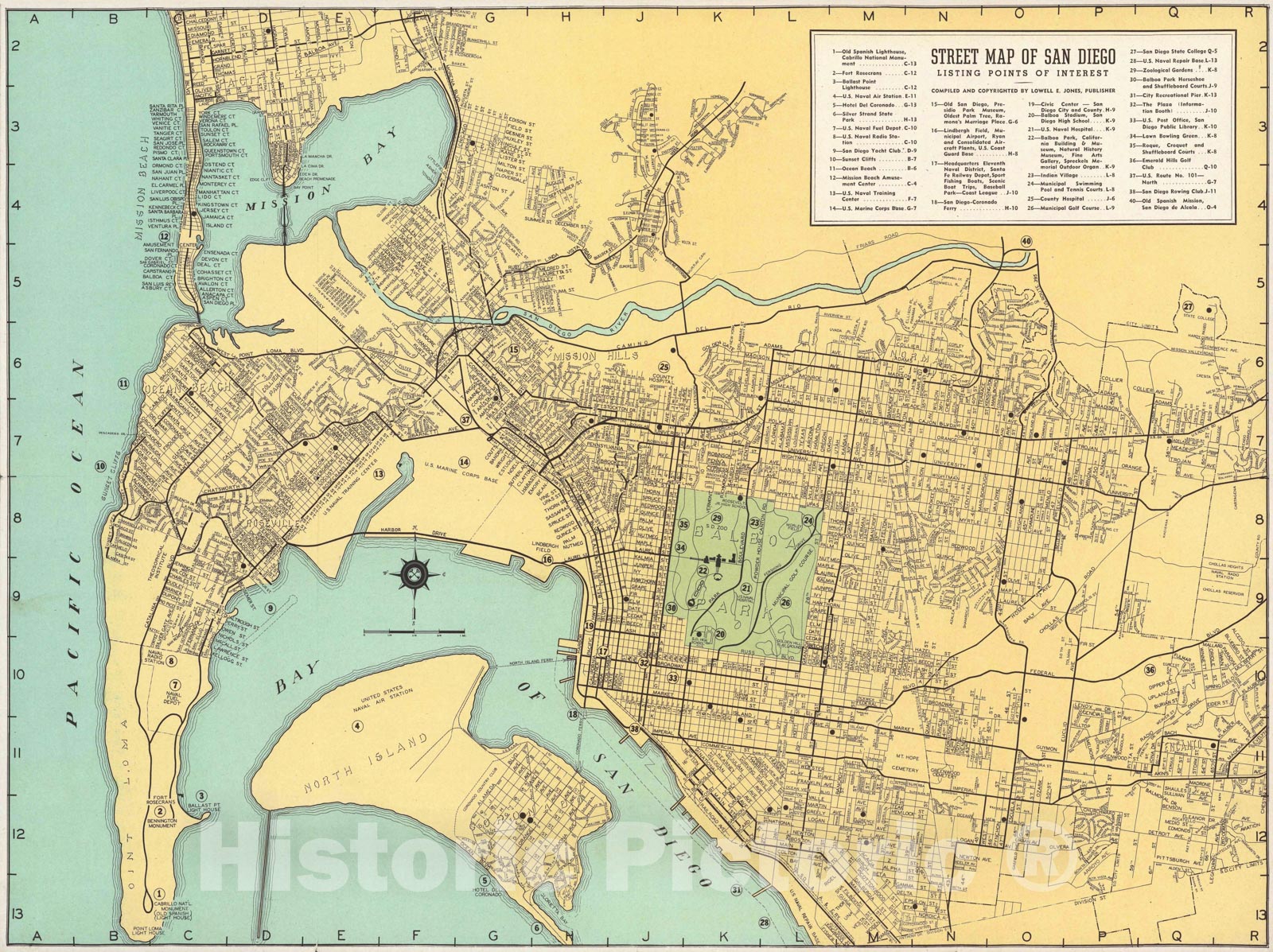 Historic Map Street Map of San Diego City, 1935 Vintage Wall